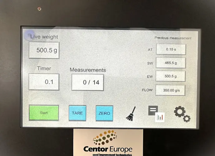 The FlowTEk v2 is PLC controlled and has an integrated scale for weighing. After selecting the number of measurements required and the time of flow, the FlowTEK can run the desired number of measurements and will weigh each flow measure. This makes handling much more efficient and results more consistent. Results, collected by the PLC, are presented in a table, and the seed flow (g/sec) is automatically calculated. These results can be downloaded onto a USB drive or, when connected to the local network, directly to your computer.